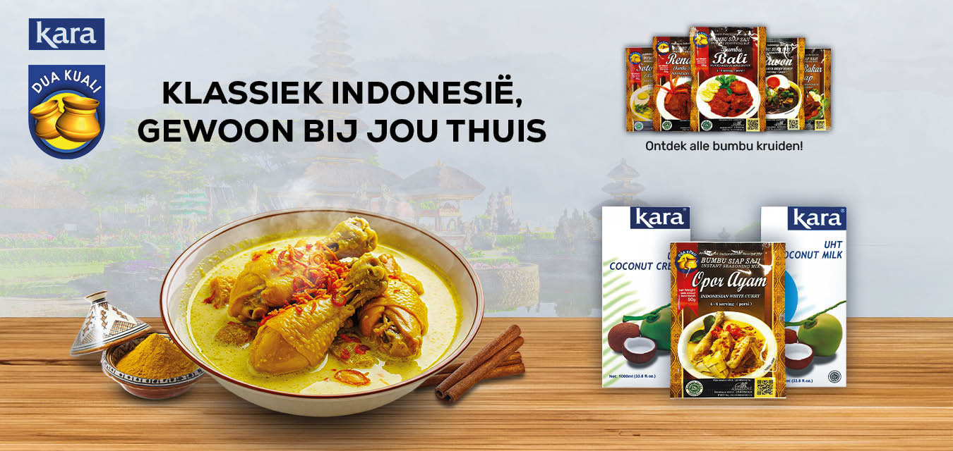 Opor Ayam is zo’n gerecht dat je vaak tegenkomt aan de Indonesische eettafel. Zacht gestoofde kip in een romige kokossaus, vol geurige kruiden. Met de bumbu van Dua Kuali en een scheut Kara kokosmelk zet je dit gerecht eenvoudig zelf op tafel. Laat het rustig pruttelen en proef hoe alles samenkomt in één warme, volle saus. Probeer het zelf en maak er een gezellig eetmoment van.