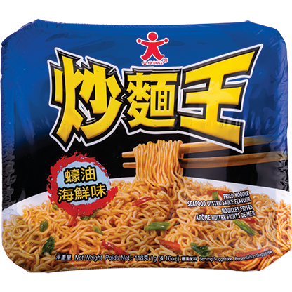 Fried noodle seafood oyster sauce is een voorgekookte en gedroogde noedelblok in een bak, met aroma poeder en/of kruidenolie en gedroogde groenten. De kruidenmix wordt aangeboden in een afzonderlijk pakket. Het is een heerlijke noedel met een milde vissige smaak.