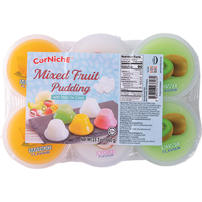 De fruitpudding mix van Corniche is heerlijke fruitpudding met nata de coco stukjes! De puddingen zijn individueel verpakt en zijn erg lekker als dessert of als een zoet en fruitig tussendoortje.