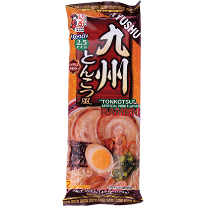 Japanse ramen met heerlijke varkensbottenbouillonsmaak. Vrij van dierlijke producten en klaar te maken in slechts 2,5 minuut.