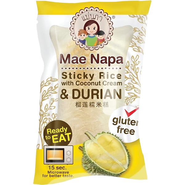 Zin in een snelle Thais dessert? De combinatie van kleefrijst met kokoscrème en doerian geeft het een volle rijke smaak. Ready-to-eat of of verwarm het voor 15 seconden in de magnetron.