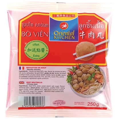 Beef meatballs zijn gemaakt van onder andere rundvlees, tarwemeel en vissaus. Beef meatballs van Oriental Kitchen hebben een intense smaak van rundvlees en een stevige bite van textuur. Ze worden vaak gebruikt in de Aziatische keuken, vooral in een noedelsoep zoals de bekende Vietnamese pho.